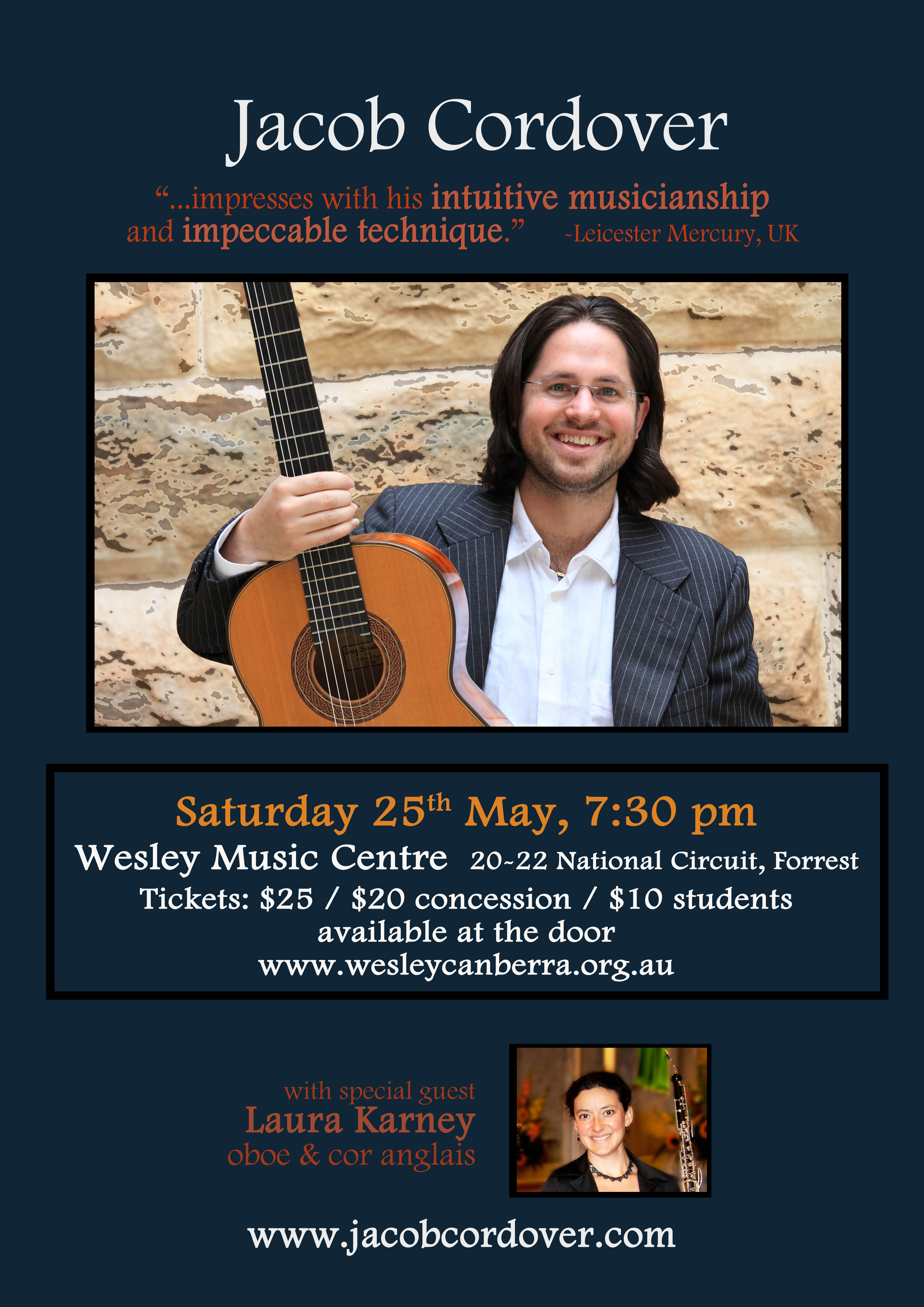 During his May tour, audiences can expect to hear works for solo guitar by Isaac Albeniz, Gaspar Sanz, Ross Edwards, Leo Brouwer, Lennon/McCartney and more. In what will be Jacob’s only Australian performances for 2013, Jacob will be joined by special guest Laura Karney (oboe & cor anglais). Together they will perform music for guitar and oboe and guitar and cor anglais including the beloved Siete Canciones Populares Españolas (7 Popular Spanish Songs) by Manuel de Falla.